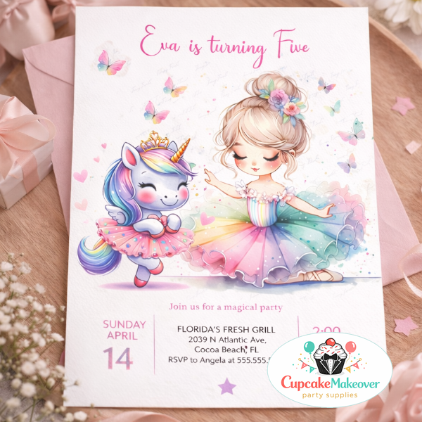 Create a magical celebration with this enchanting ballerina unicorn birthday invitation, perfect for your little girl’s birthday party. Featuring a dreamy rainbow tutu ballerina, a cute unicorn, and soft pastel butterflies, this design is ideal for a princess birthday, ballet dance party, or unicorn themed celebration.