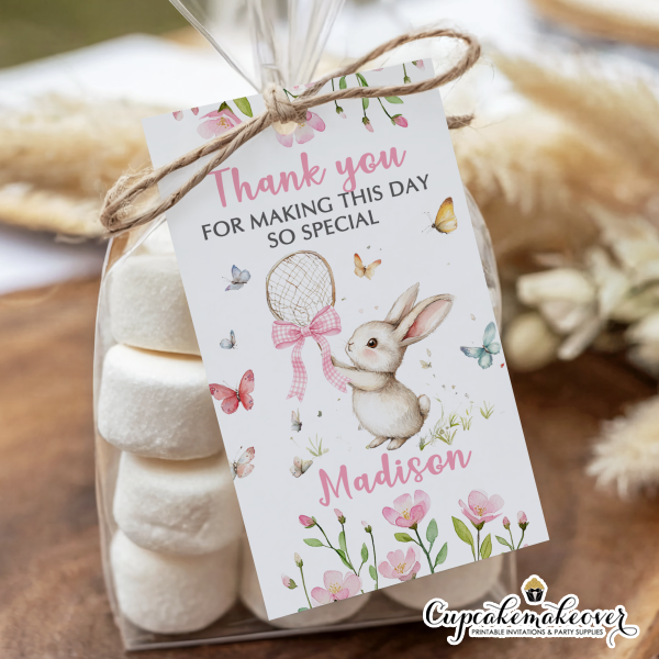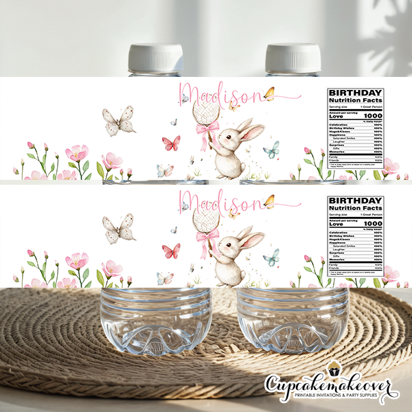Make your child’s birthday extra magical with these adorable bunny rabbit water bottle labels, perfect for decorating drinks at kids’ birthday parties, first birthdays, baby showers or themed events! Featuring sweet rabbit holding a net with butterflies and flowers, our custom birthday bottle labels turn plain water bottles into cute party!