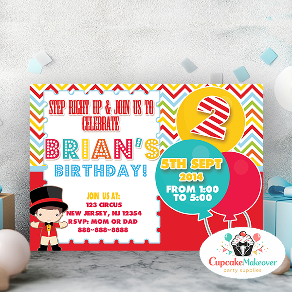 So come one, come all! Invite family and friends to celebrate the birthday of your child with this fun circus or carnival themed invitation!