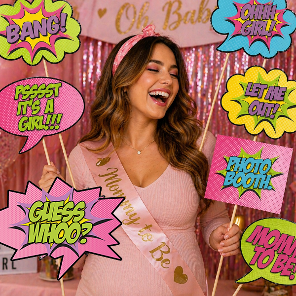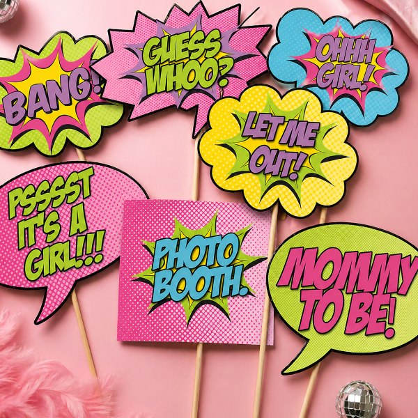 Inspired by pop art and retro comic books, this set features vibrant colors, fun expressions like “Ohh Girl!”, “Guess Who?”, and “It’s a Girl!”—perfect for capturing unforgettable moments.
