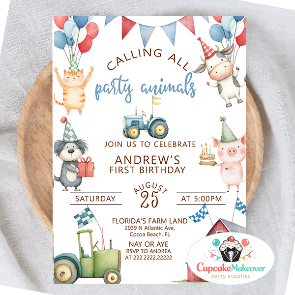 With the charming phrase “Calling All Party Animals”, this invitation instantly sets the tone for a joyful celebration filled with smiles, laughter, and farm fun. Ideal for boys or unisex parties, this design works beautifully for barnyard, farm, country, or party animals birthday themes.
