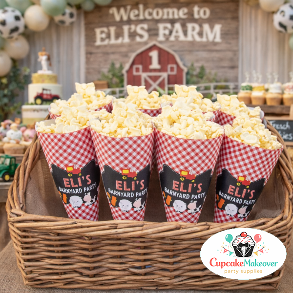 Farm party favor cones perfect for holding “corn” (freshly popped corn, that is) personalized with the birthday boy’s name. Simply select the bottle label option for this item.