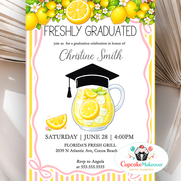 Celebrate your graduate with this fresh and cheerful lemon-themed graduation invitation perfect for summer parties! Features a trendy pink and yellow citrus design with a playful lemonade topped with a graduation cap perfect for a fun celebration.
