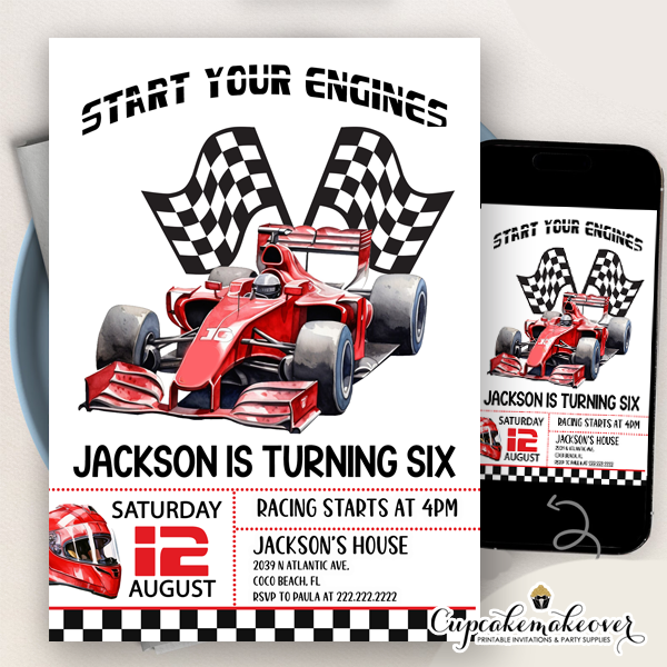 Get ready to rev your engines and race into an action-packed Race Car Theme Birthday Party!! The Race Car Birthday Invitations feature a red racing car against 2 checkered flags. The perfect invitation to your boy’s race car themed birthday party.