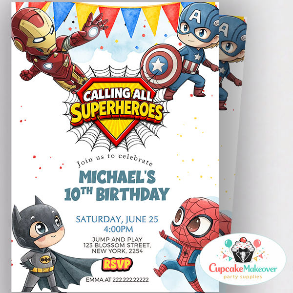 Get ready for an action-packed celebration with this bold and playful superhero birthday invitation, perfect for your little hero’s big day. Designed with vibrant red, blue, and yellow colors, this invite features a dynamic comic-style “Calling All Superheroes” emblem, fun character illustrations, and festive details like pennant banners and confetti.
