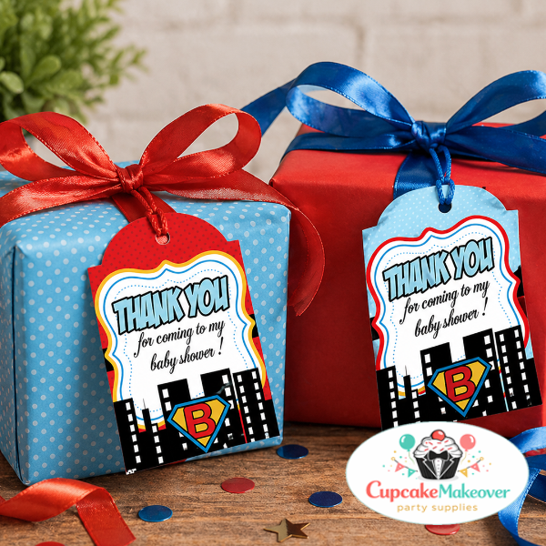 This set of Baby Shower Thank You favor tags & notes are a great way to thank your guests for their gifts and wishes. This superhero-themed favor bag, finished with a bold comic-style “Thank You for coming to my baby shower!” tag, is the perfect way to show your appreciation. Paired with a blue ribbon and colorful treats, it creates a fun, coordinated look that ties your entire party together.