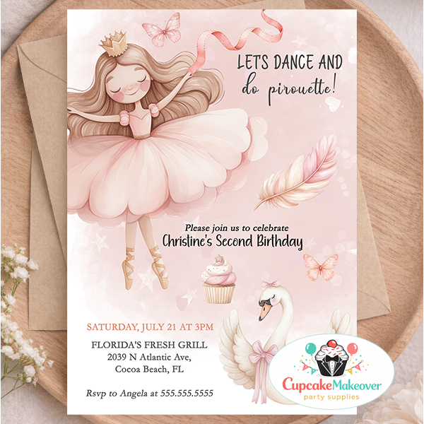 Celebrate your little ballerina’s big day with this beautiful ballerina birthday invitation featuring a soft pink princess theme, delicate ballet slippers, fluttering butterflies, and a graceful swan. This elegant 2nd birthday invitation for girls is perfect for a ballet birthday party, dance themed birthday, or princess ballerina celebration. The dreamy watercolor style and feminine blush tones make this invite ideal for parents looking for a charming and stylish girl birthday invitation template. Great for a Two Sweet birthday party, toddler birthday celebration, or digital party invite for a pink ballerina theme.