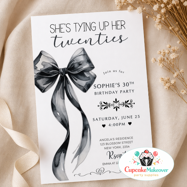 This 30th birthday invitation black bow is designed for a coquette aesthetic birthday party. It features a black ribbon illustration, minimalist black and white layout, and modern script typography. The complete set for the sweet table includes matching party stationery such as cupcake toppers, favor tags, candy bag toppers, and coordinated packaging designs, all aligned with the same black bow and neutral theme.