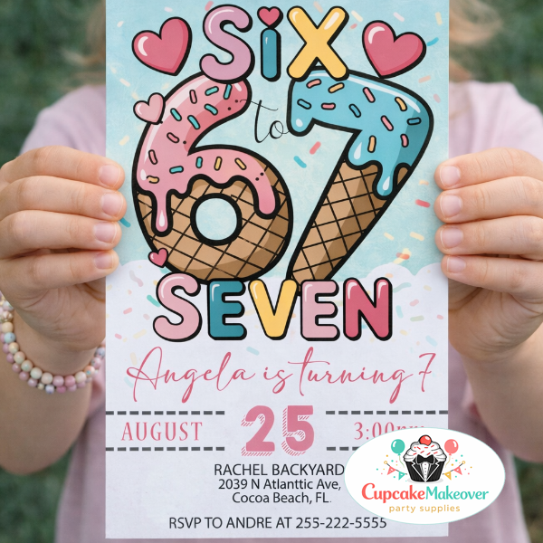 Make your child’s celebration extra special with this fun and trendy “Six to Seven” birthday invitation! This playful design features colorful ice cream number 6 and 7 graphics, sprinkles, hearts, and a bold cartoon style that’s perfect for a 7th birthday party invitation.