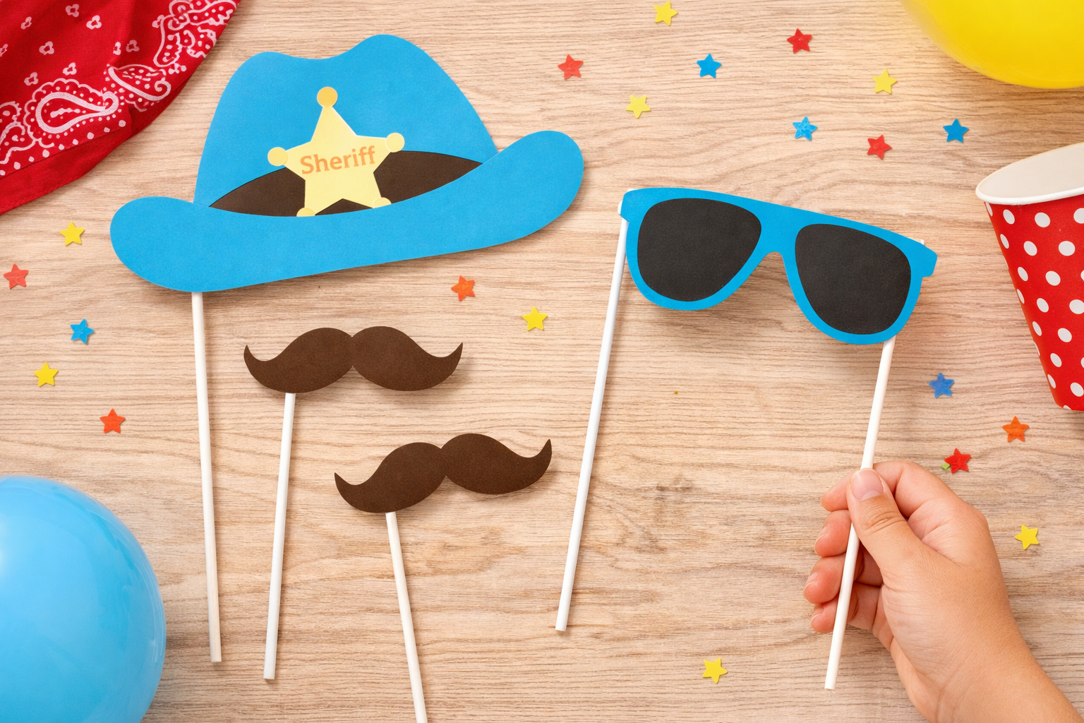 - 2 set of cutouts (1 Pink + 1 Blue): mustaches, sheriff star & eyeglasses
